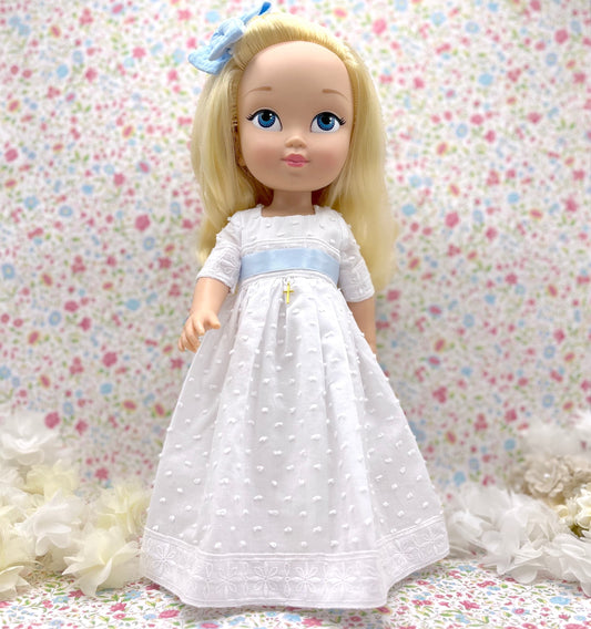 Muñeca de comunión personalizada con vestido Rebecca plumeti