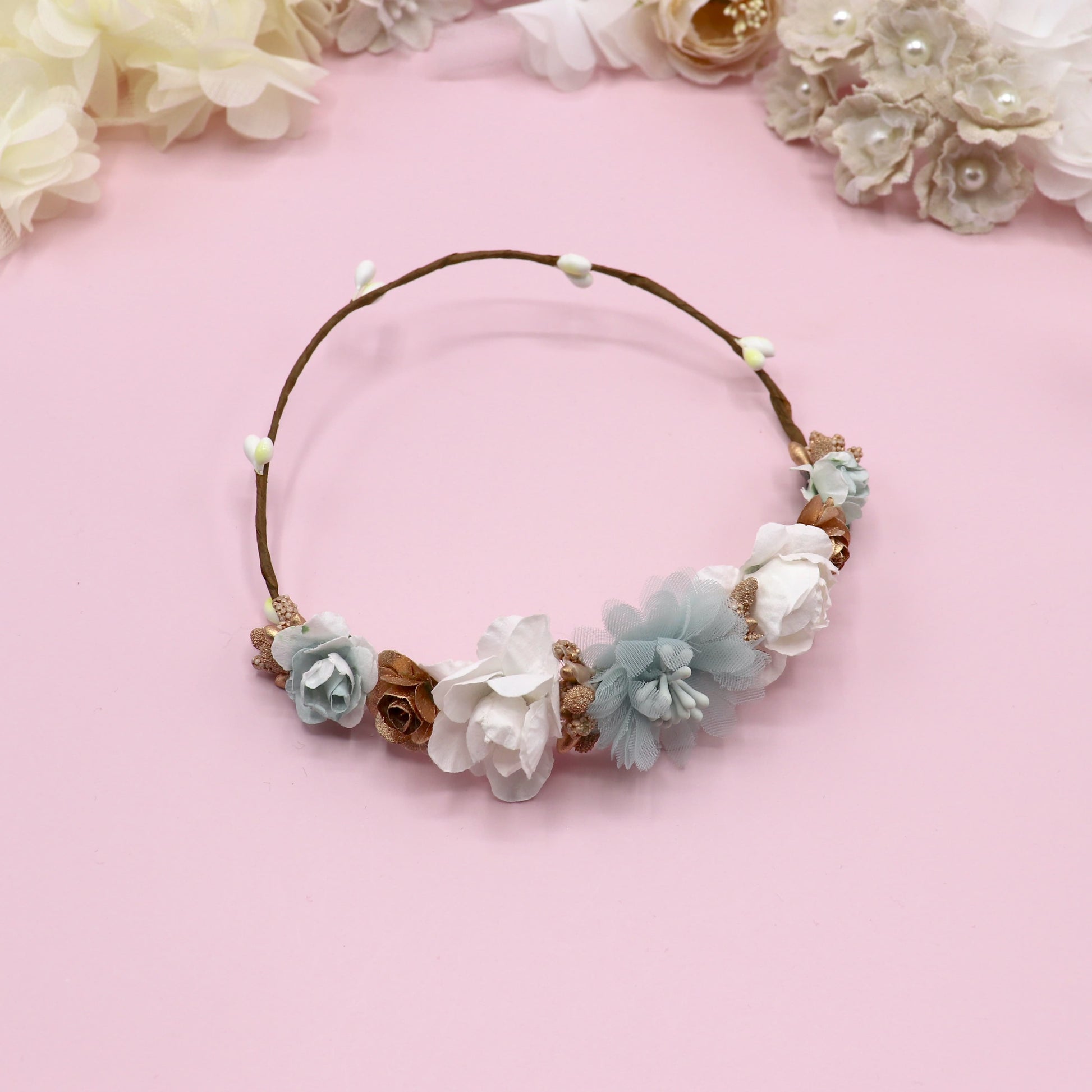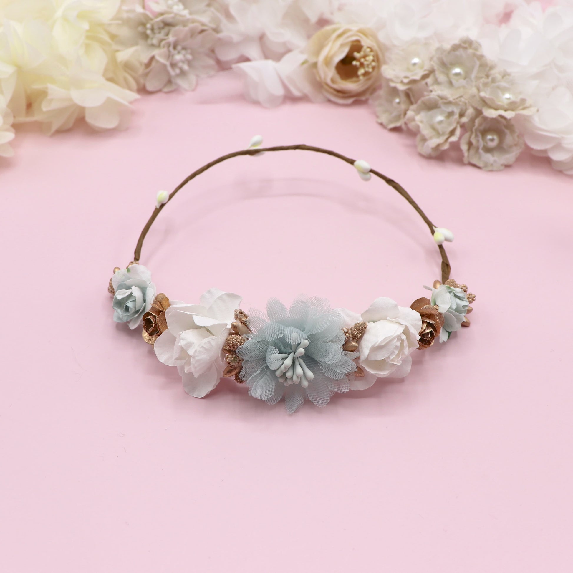 Coronita con importancia de flores a un lado con pistillos blancos y toque dorado.