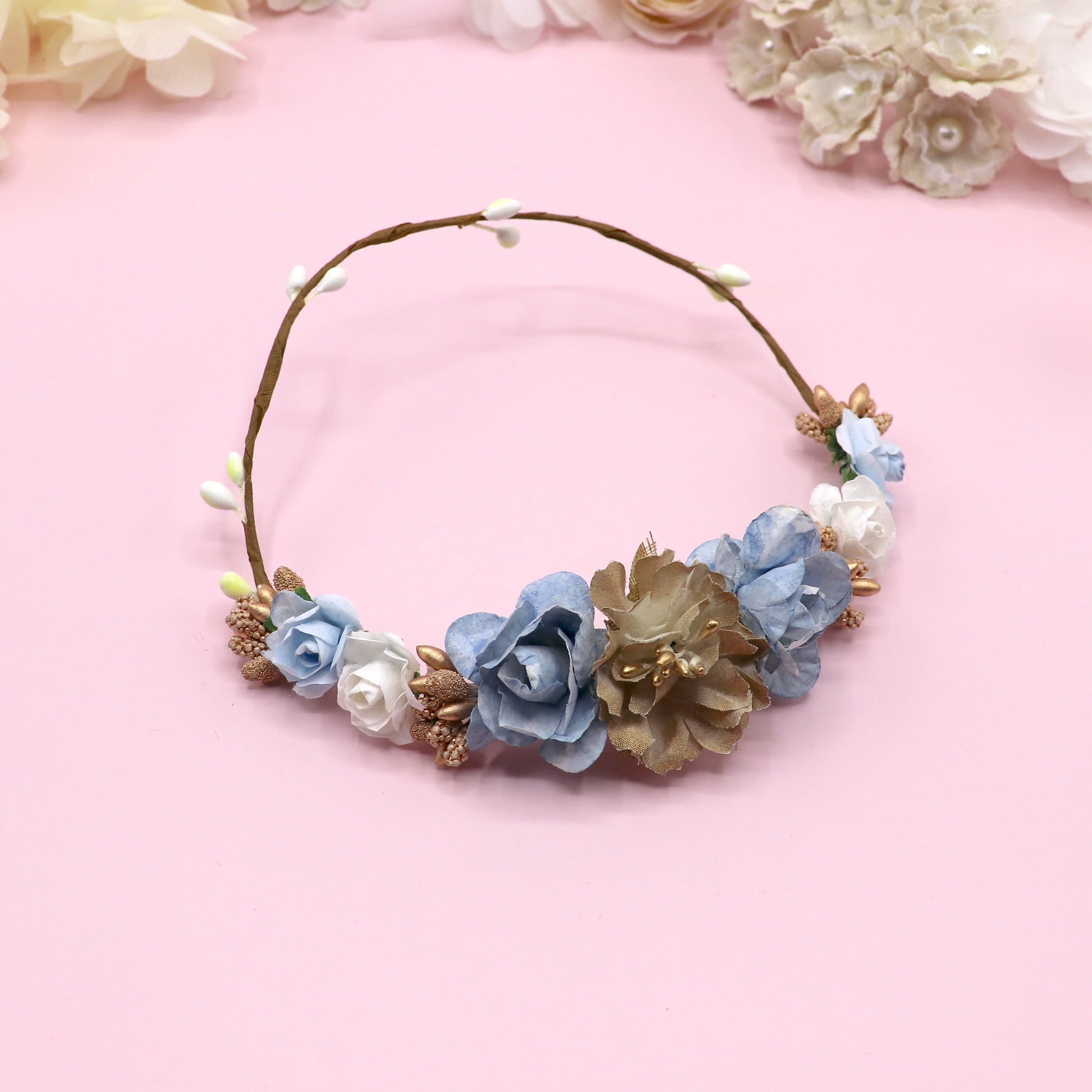 Coronita con importancia de flores a un lado con pistillos blancos y toque dorado.