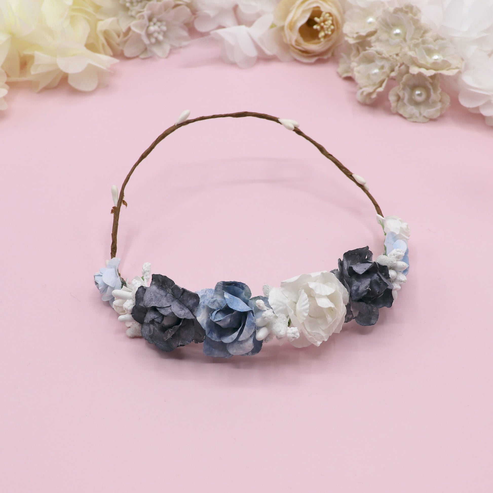 Coronita con mitad de flores tamaño medio y pistillos para muñeca, en tonos azul tinta, ceste y blanco.