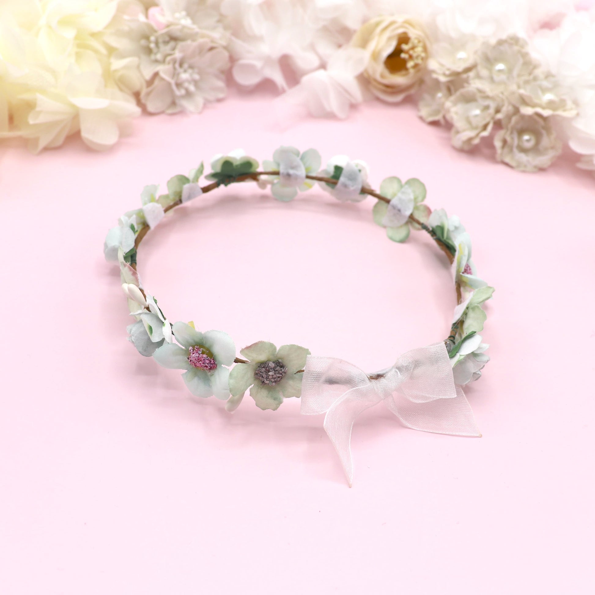 Coronita completa de flores tamaño pequeño para tu muñeca con lazo de organza blanco hacia atrás.
