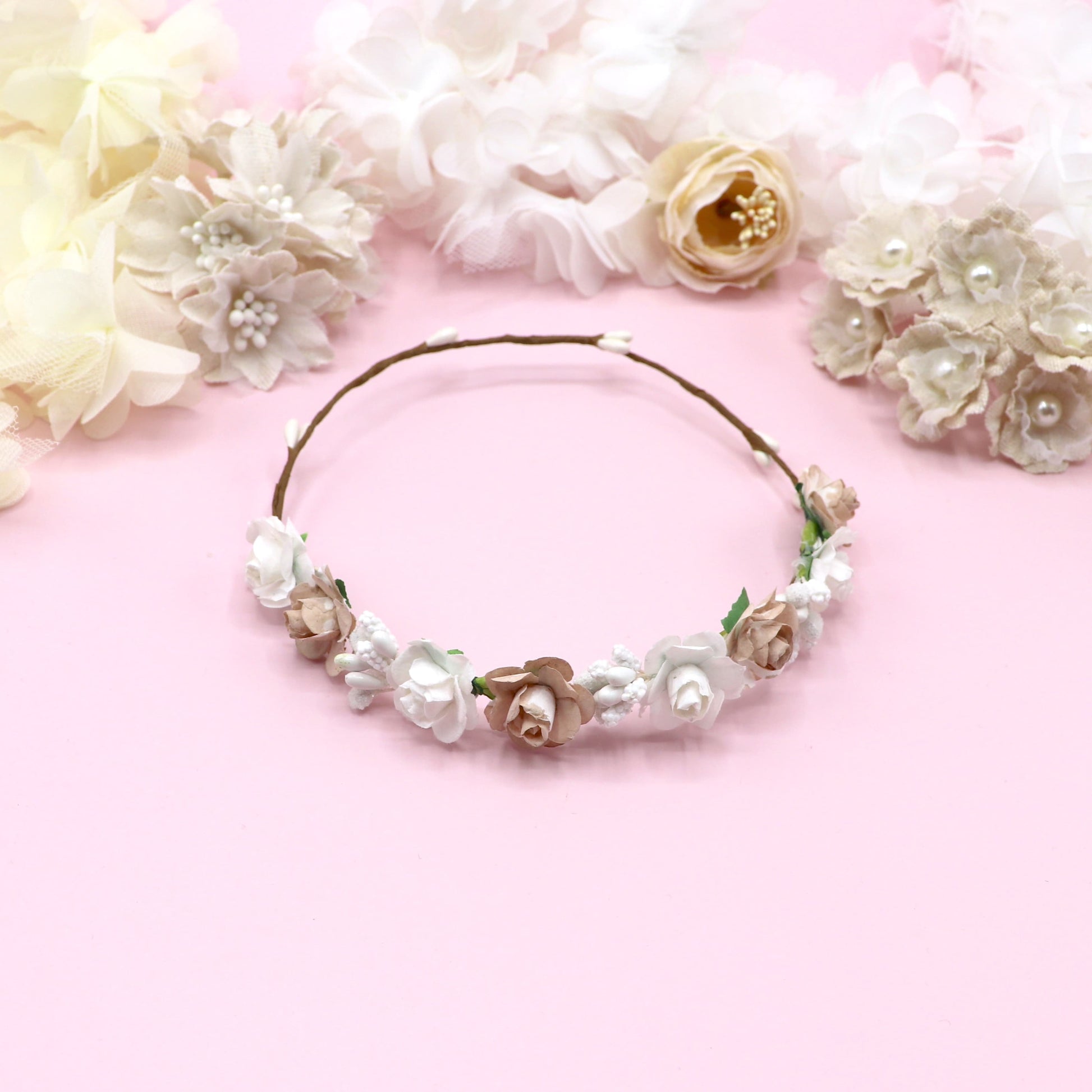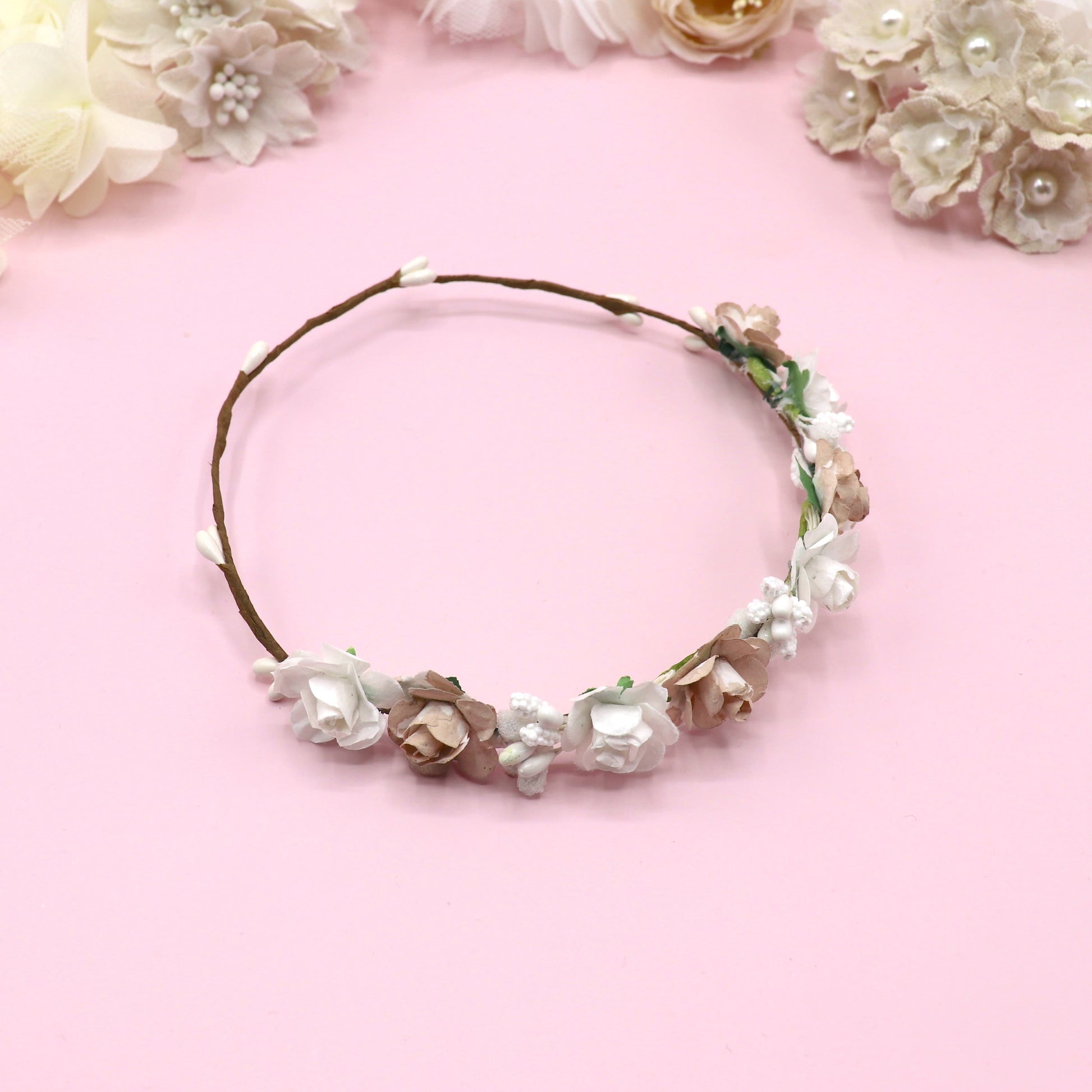 Coronita de flores tamaño pequeño para tu muñeca. Asegúrate de elegir hacia donde colocamos las flores.