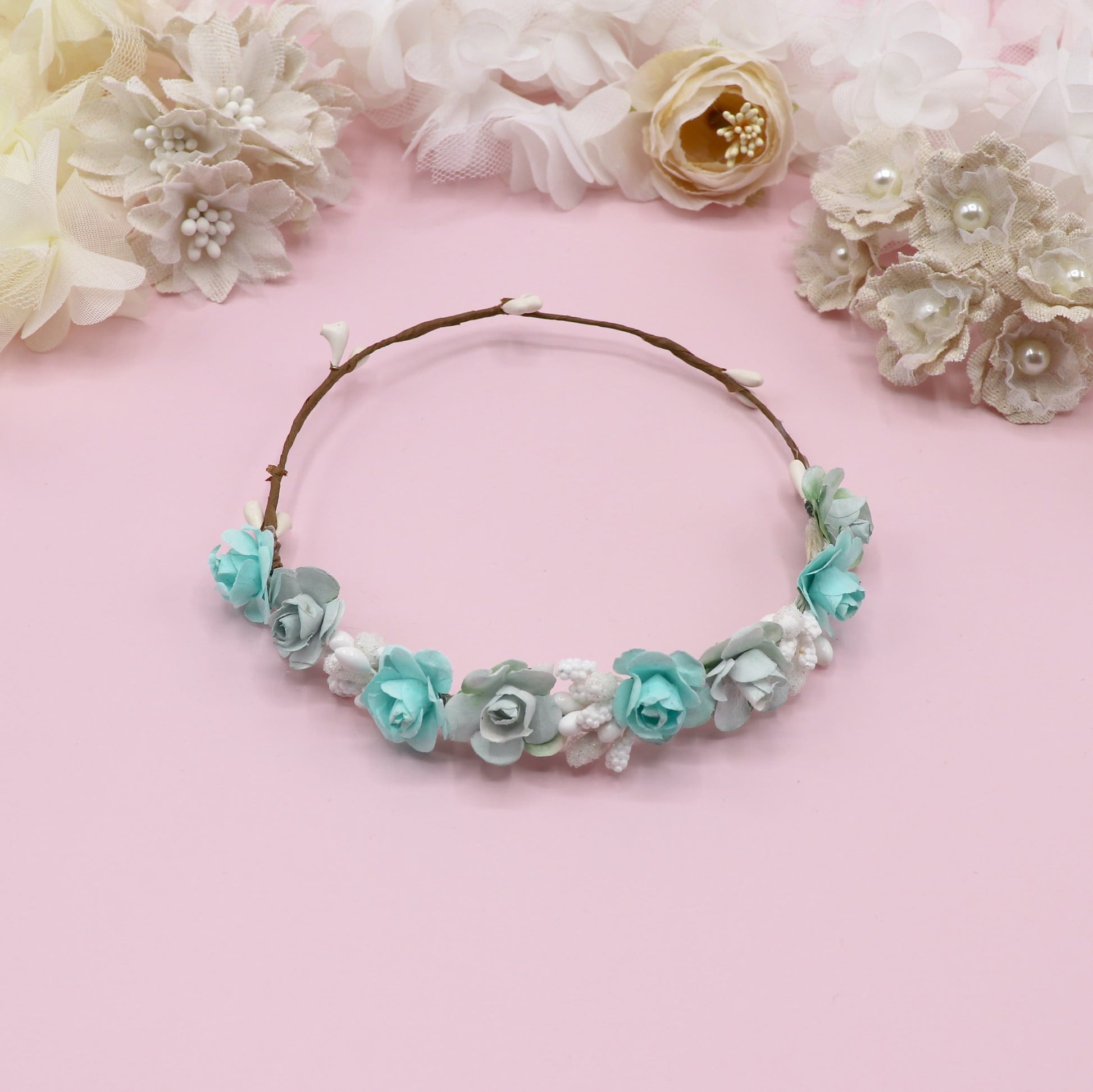 Coronita de flores tamaño pequeño para tu muñeca. Asegúrate de elegir hacia donde colocamos las flores.