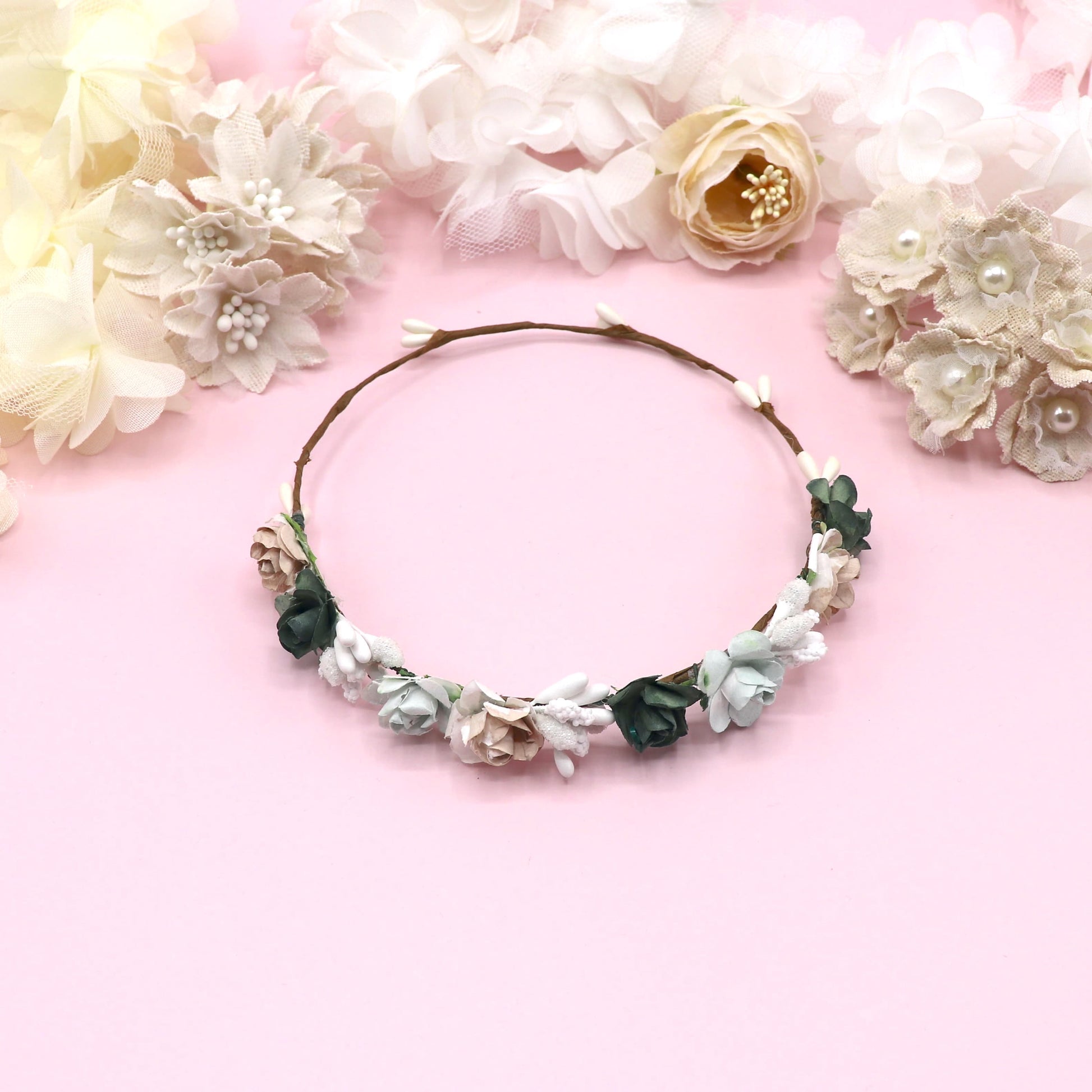 Coronita de flores tamaño pequeño para tu muñeca. Asegúrate de elegir hacia donde colocamos las flores.