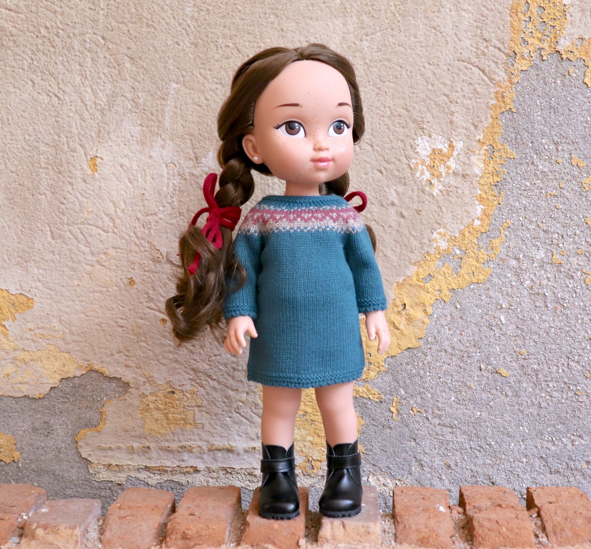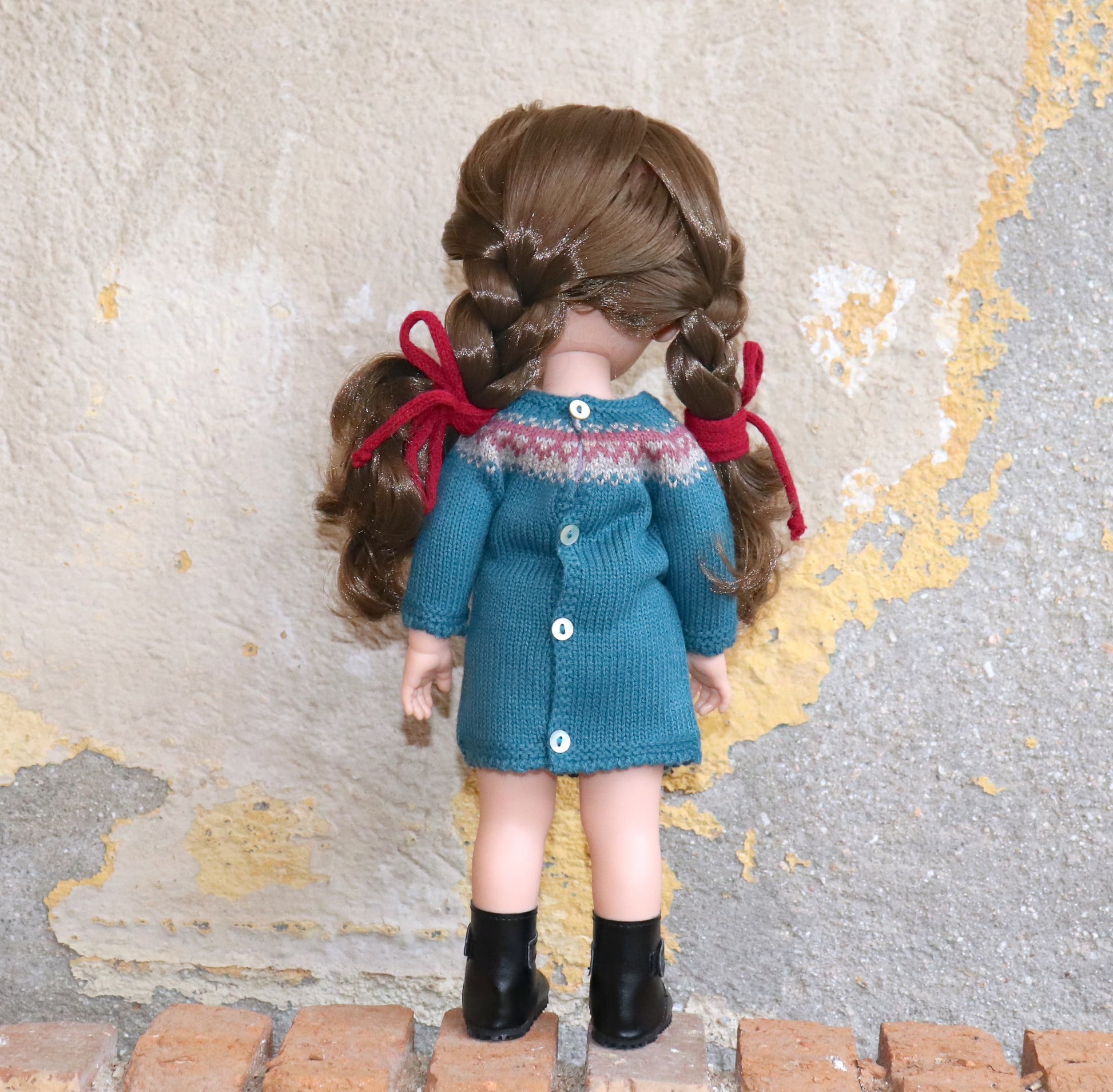 Calentito vestido de punto para tu muñeca, en colores invernales y toque de brillo. Cierra atrás con botones de nácar.