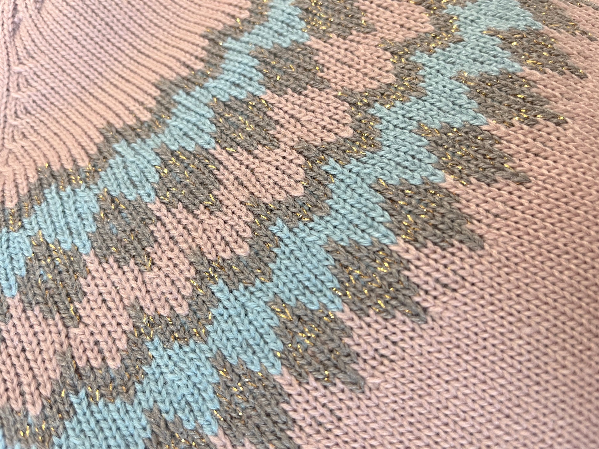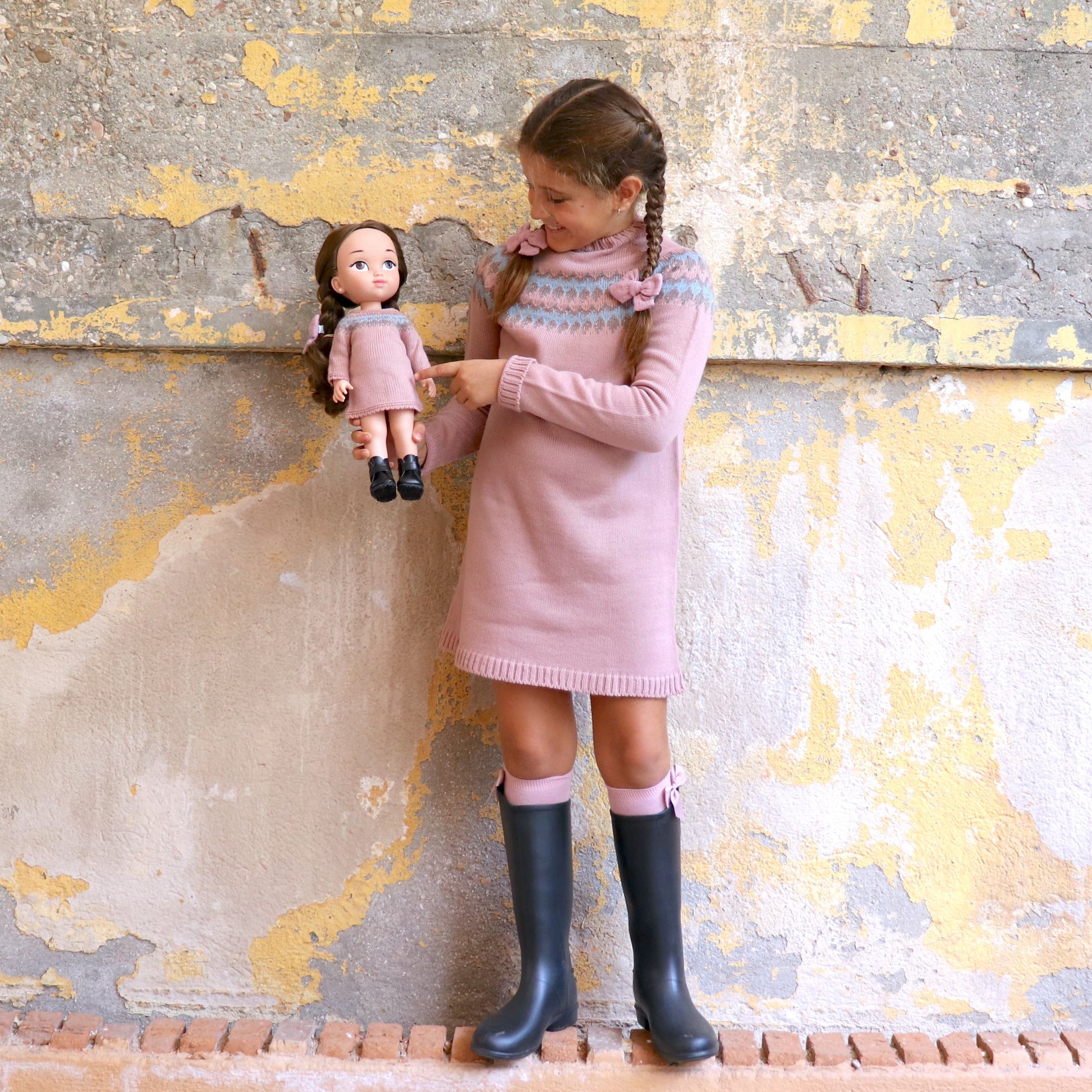 Vestido corto de punto para NIÑA, con cenefa en tonos empolvados y toque de brillo. Mismo acrílico usado para prendas de bebé.