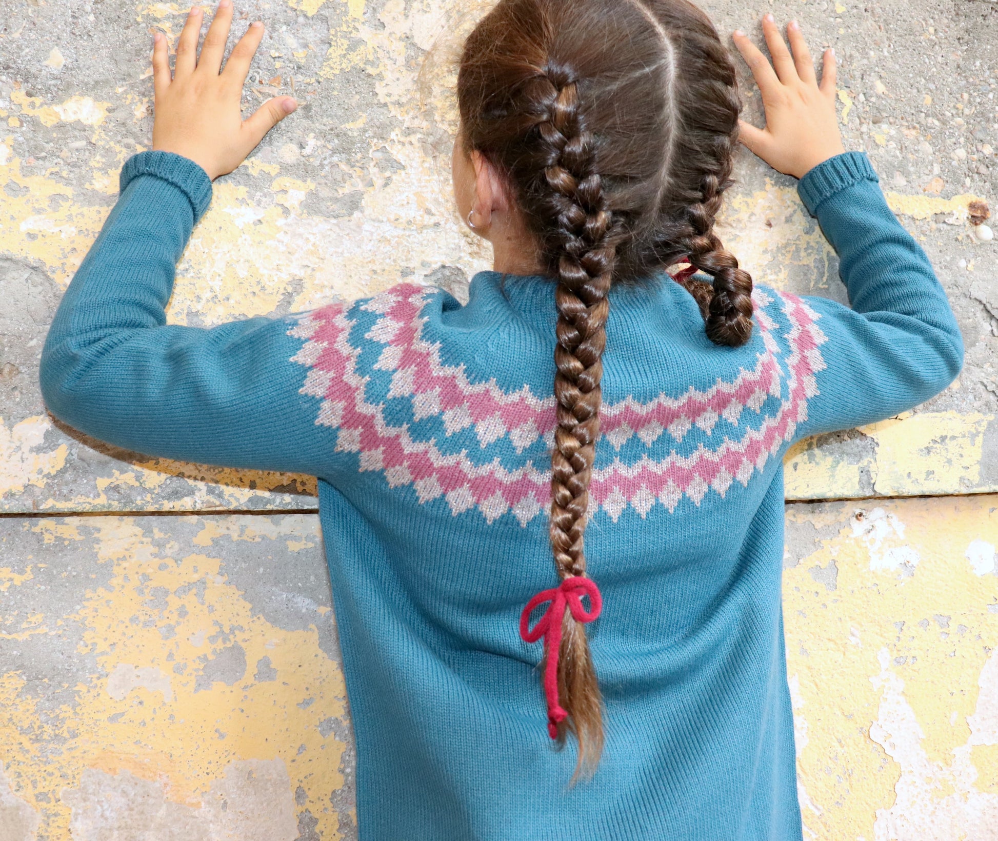 Vestido corto de punto para NIÑA, con cenefa en tonos invernales y toque de brillo.
