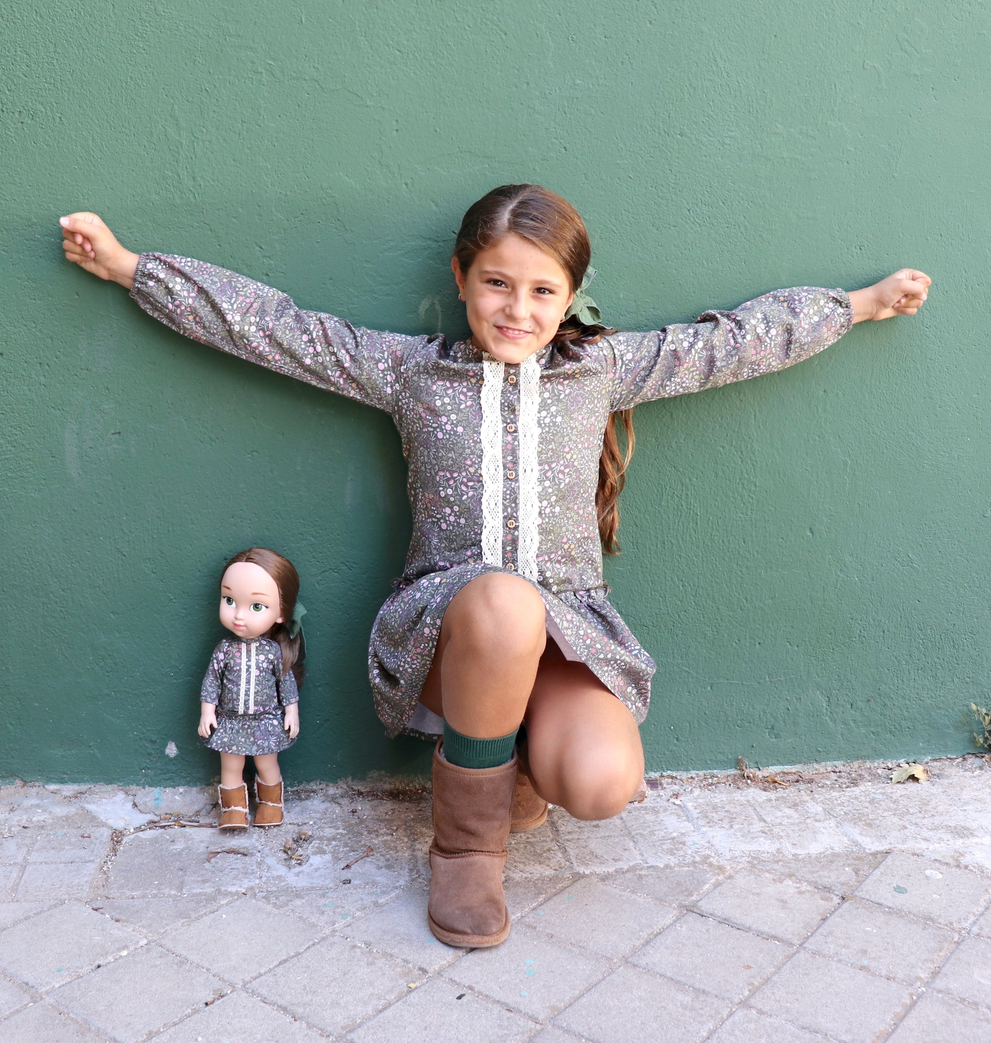 Vestido con puntillas campesinas y estampado de florecitas en tonos verdes y rosas. Cierra detrás con velcro.