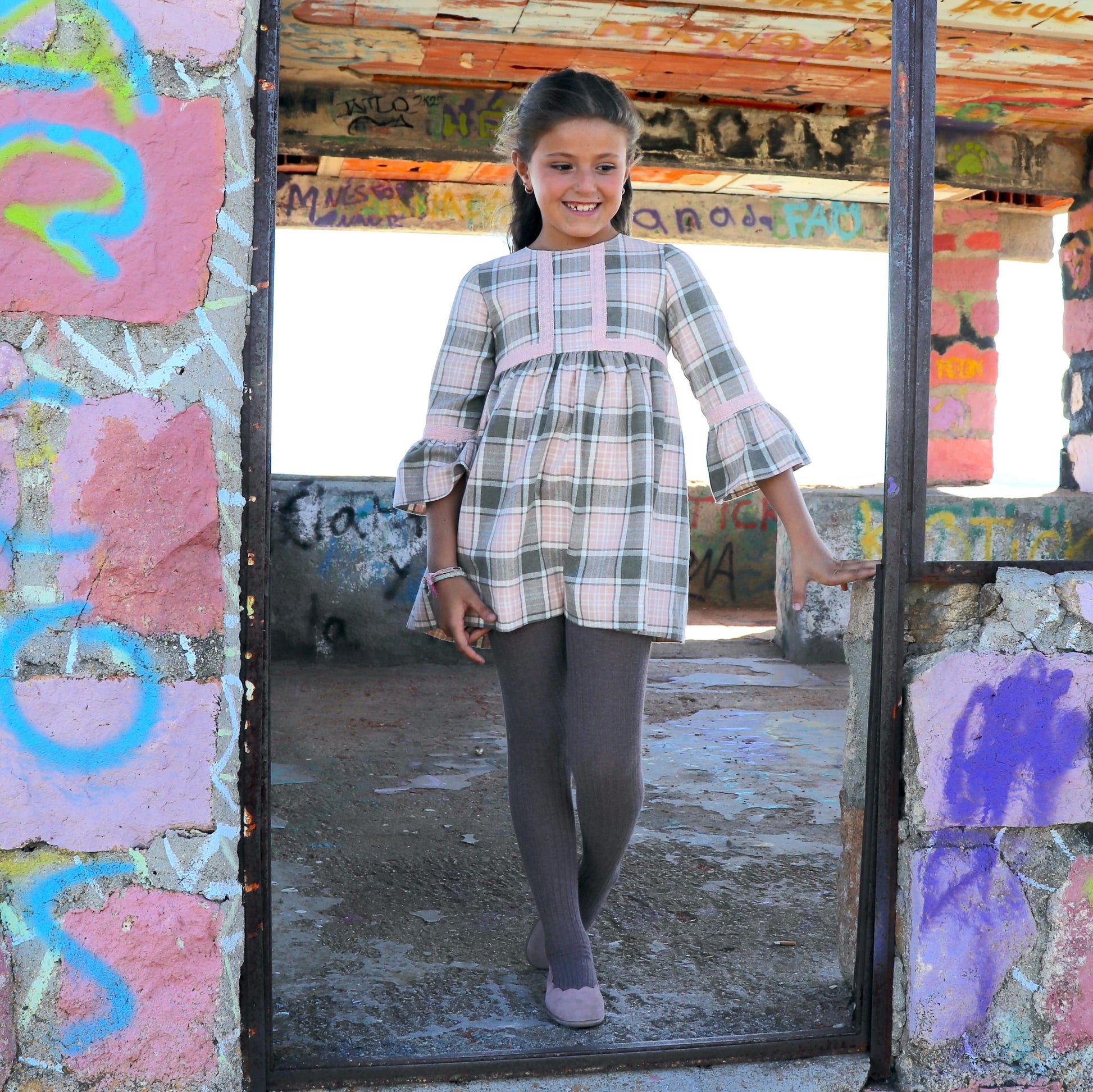 Suave y calentito vestido de franela de cuadros en rosas, crudos y piedras empolvados. Lleva como adorno cintas bordadas en algodón rosa y va forrado. También puedes comprar en PACK con su muñeca a juego, accesorios y descuento aquí.