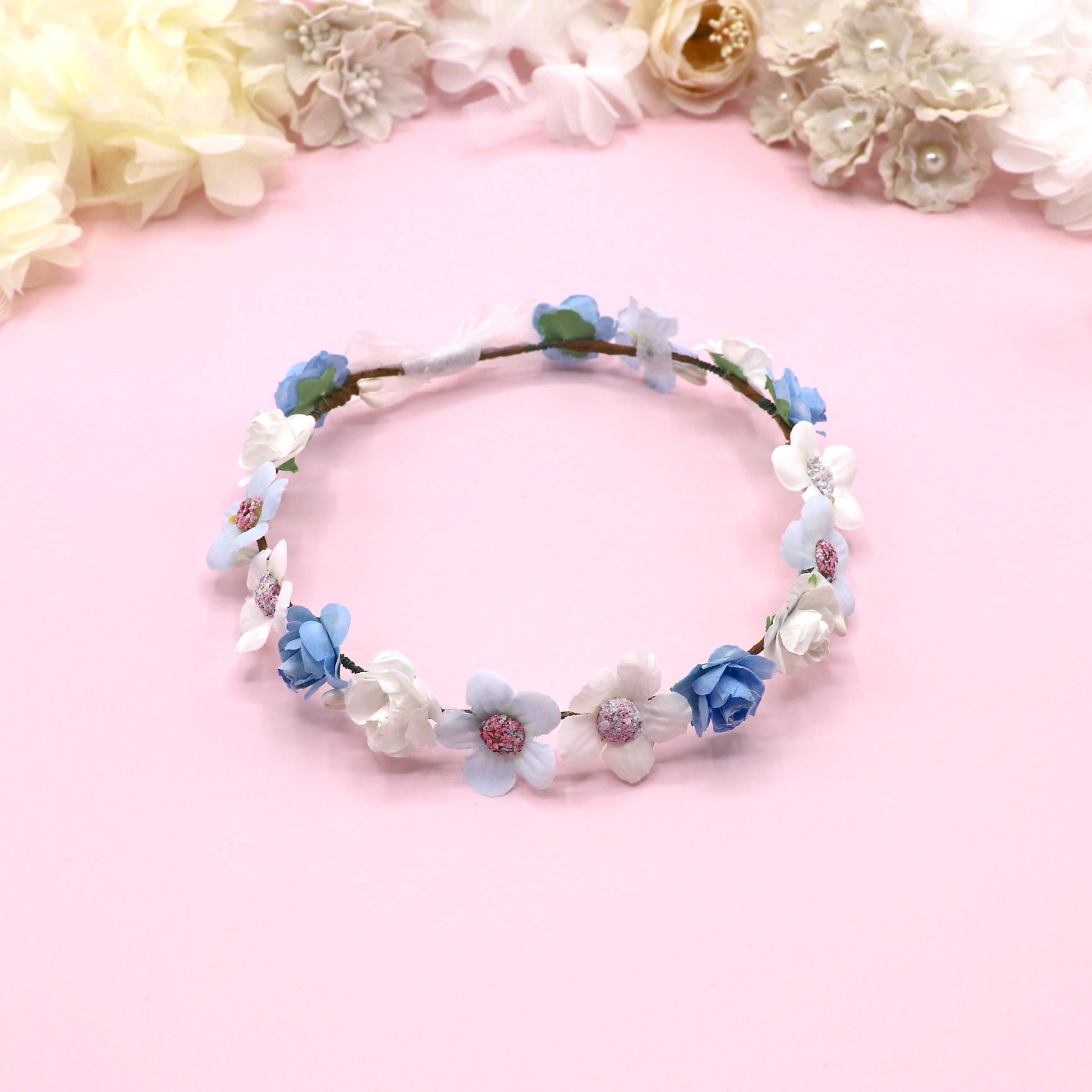 Pequena coroa cheia de flores para o pulso com laço de organza branco nas costas.