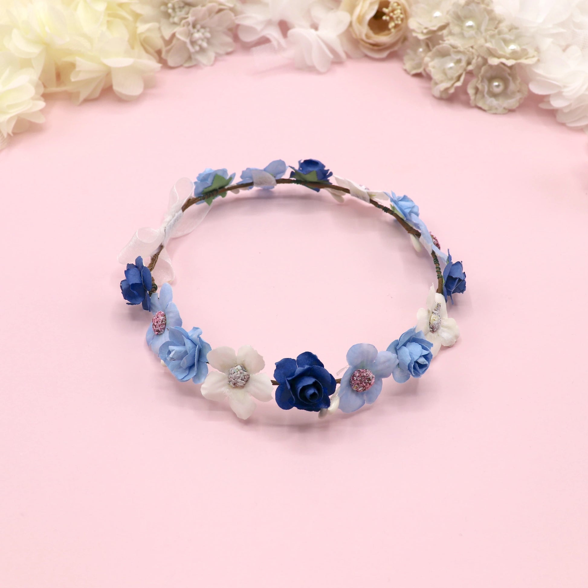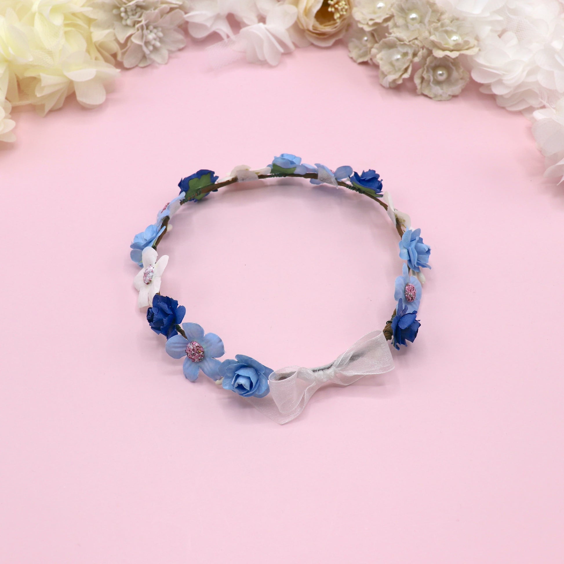 Pequena coroa cheia de flores para o pulso com laço de organza branco nas costas.